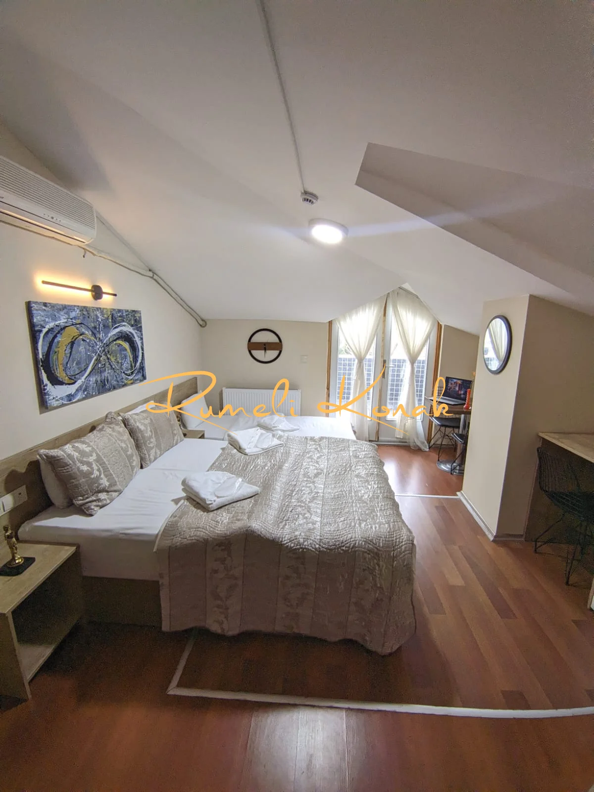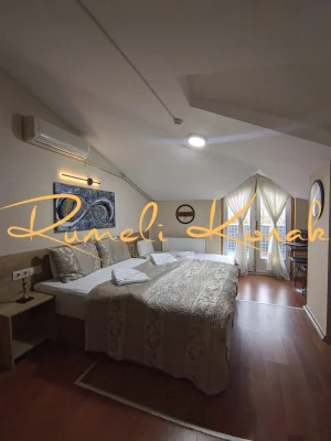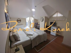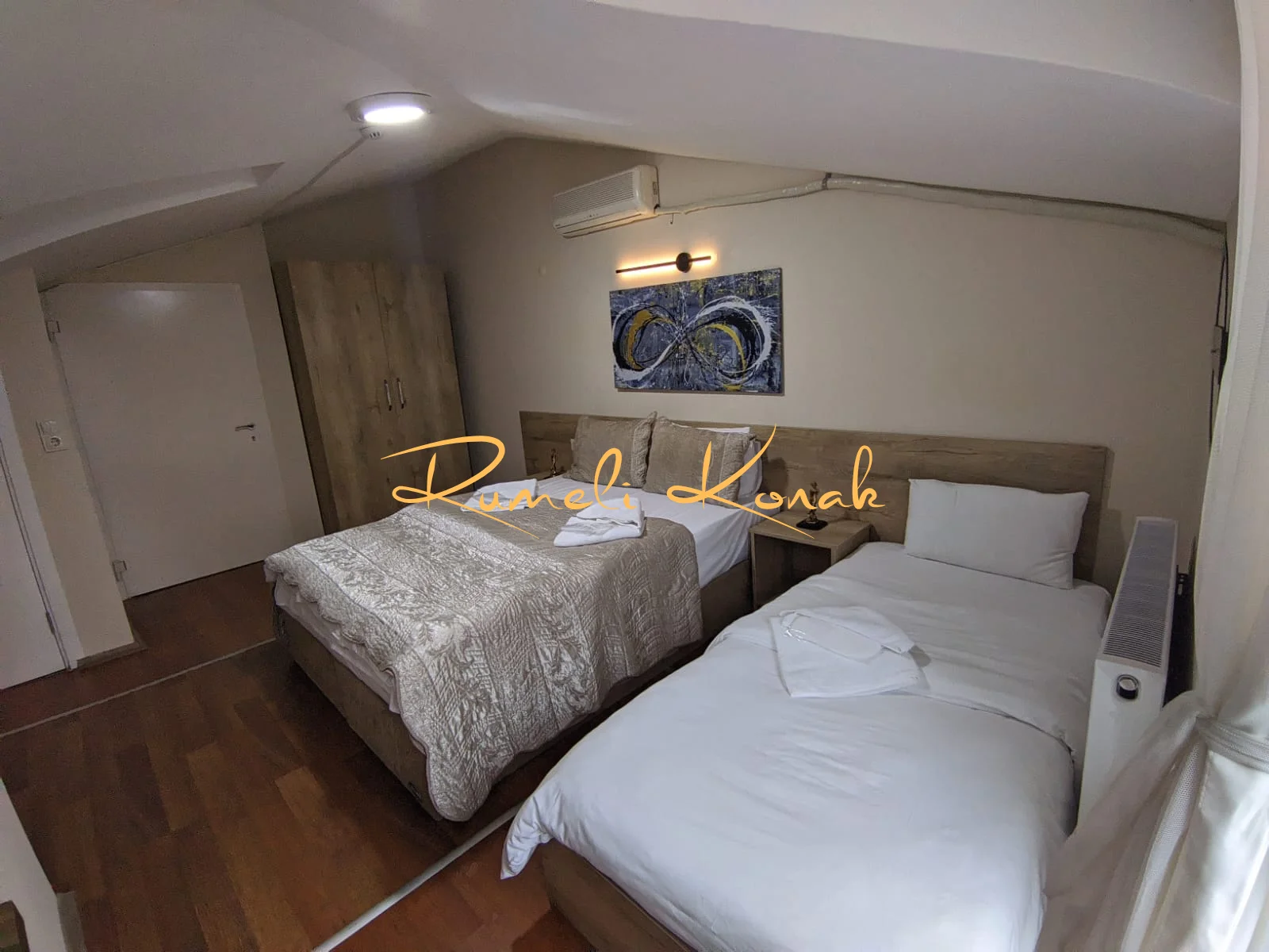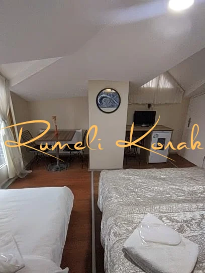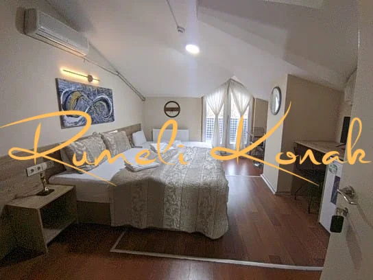 Bu odamız işletmemizin çatı katında müstakil olup balkonlu ve deniz manzaralıdır.standart olarak 1 çift kişilik ve 1 tek kişilik yatak kapasitesine sahip olup arzu edildiğinde rezervasyon talebine göre ilave tek kişilik yatak ya da bebek beşiği konulabilmektedir.